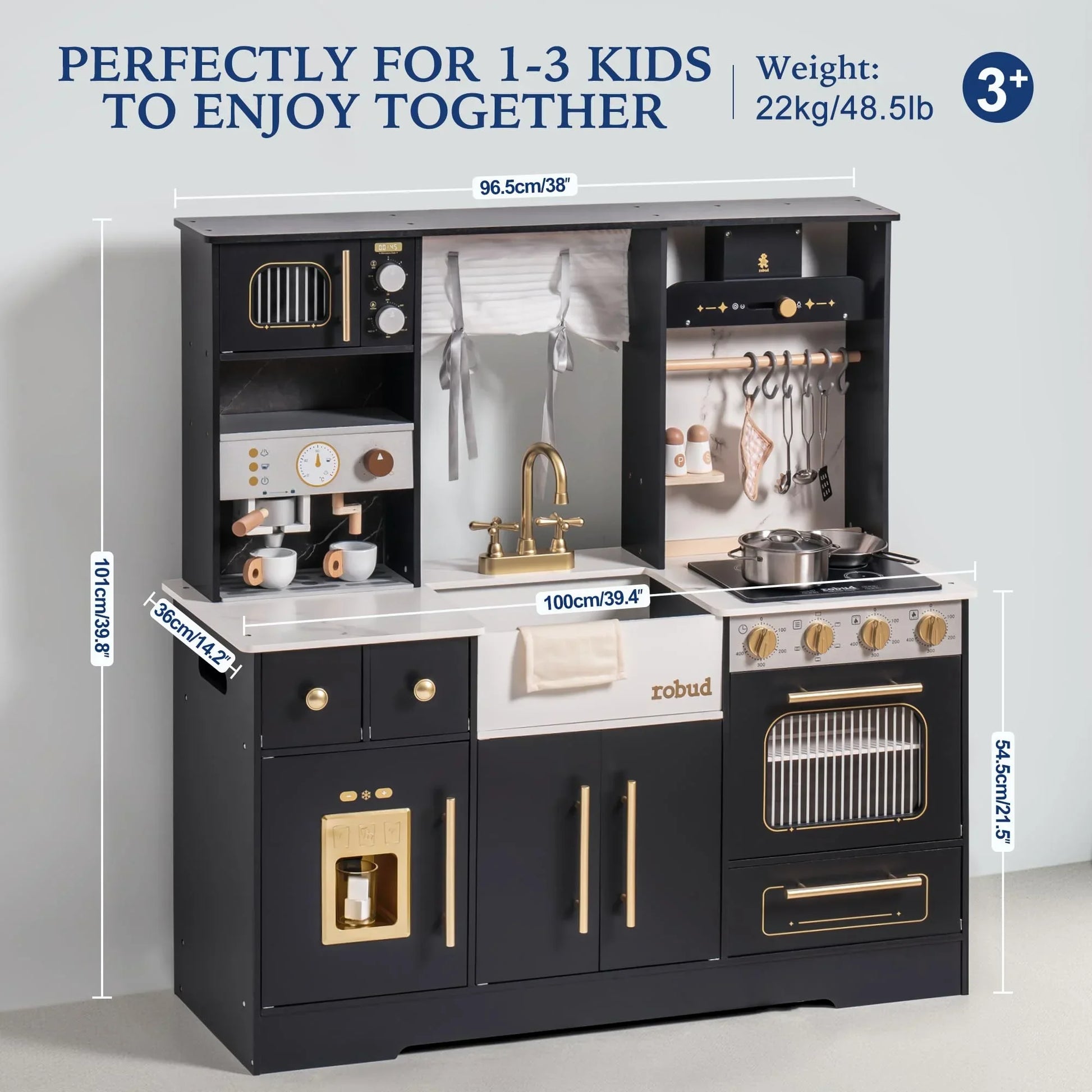 Spacious & Functional: With dimensions of 42.32 × 23.43 × 5.12 inches, the playset provides ample room for children to explore, interact, and organize their kitchen activities.