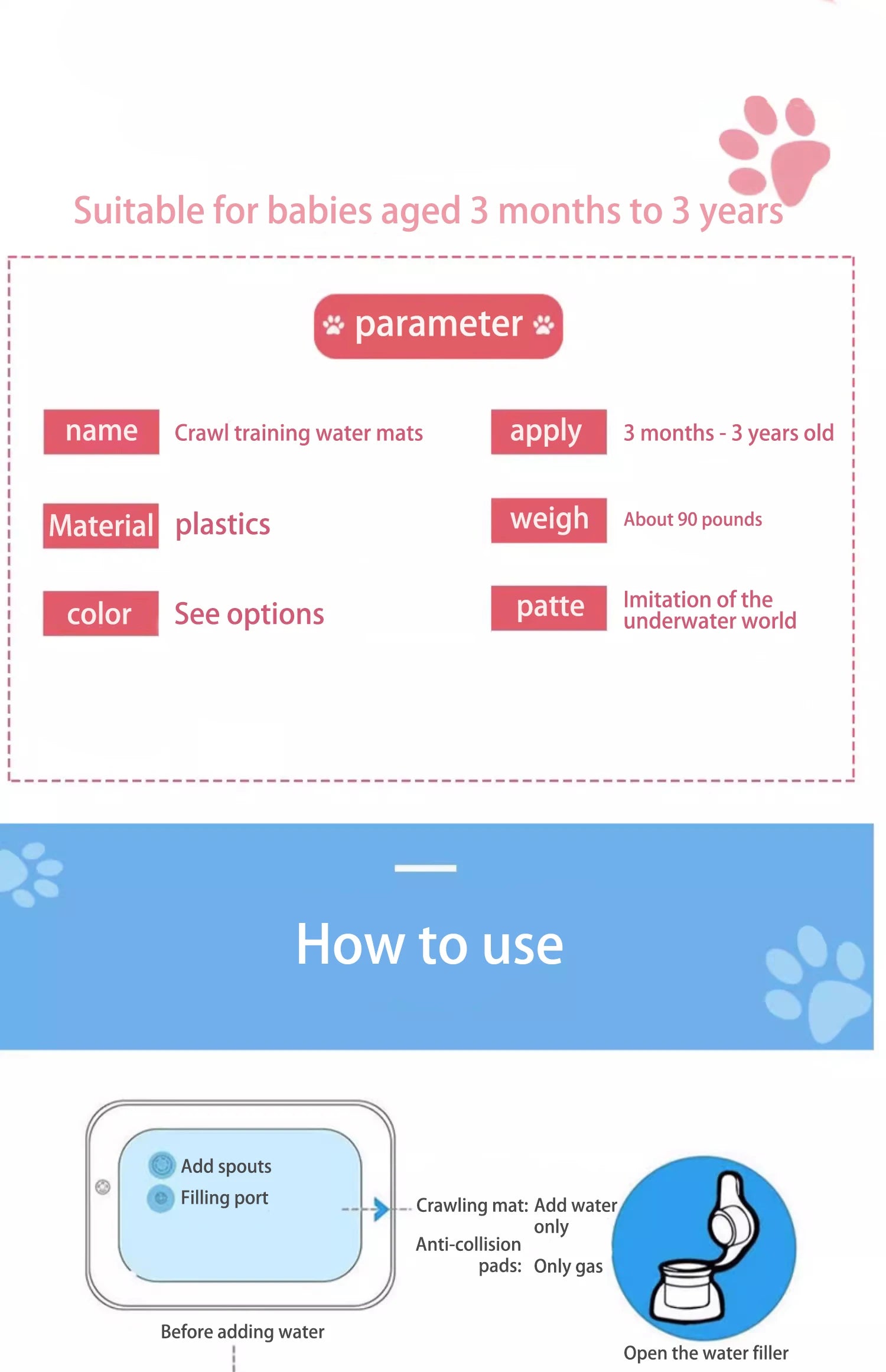 Use the nozzle on the back of the play mat to fill with water. The water level can be increased or decreased to create the desired effect.