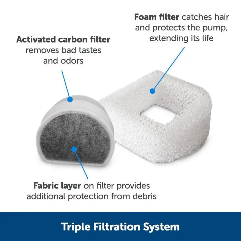 【Filtered Water】 Replaceable carbon filter removes bad tastes and odors while the foam filter catches pet hair and debris